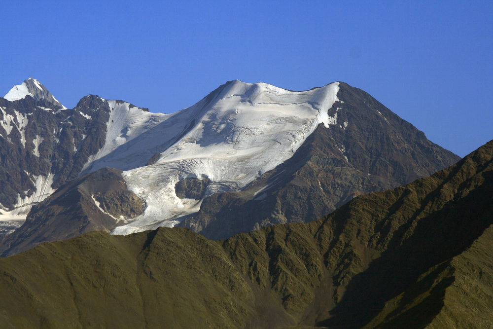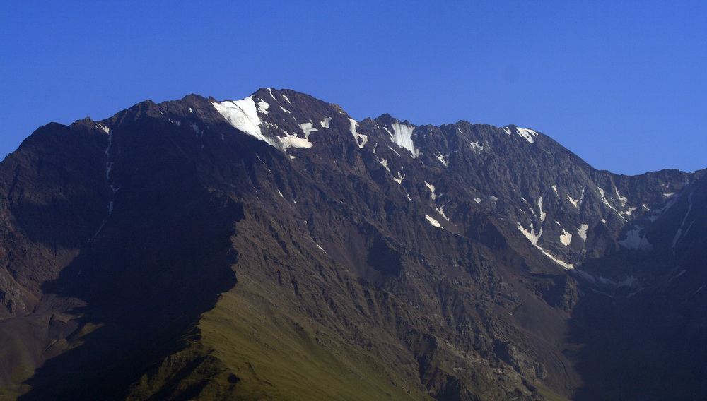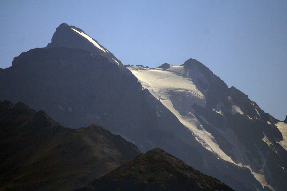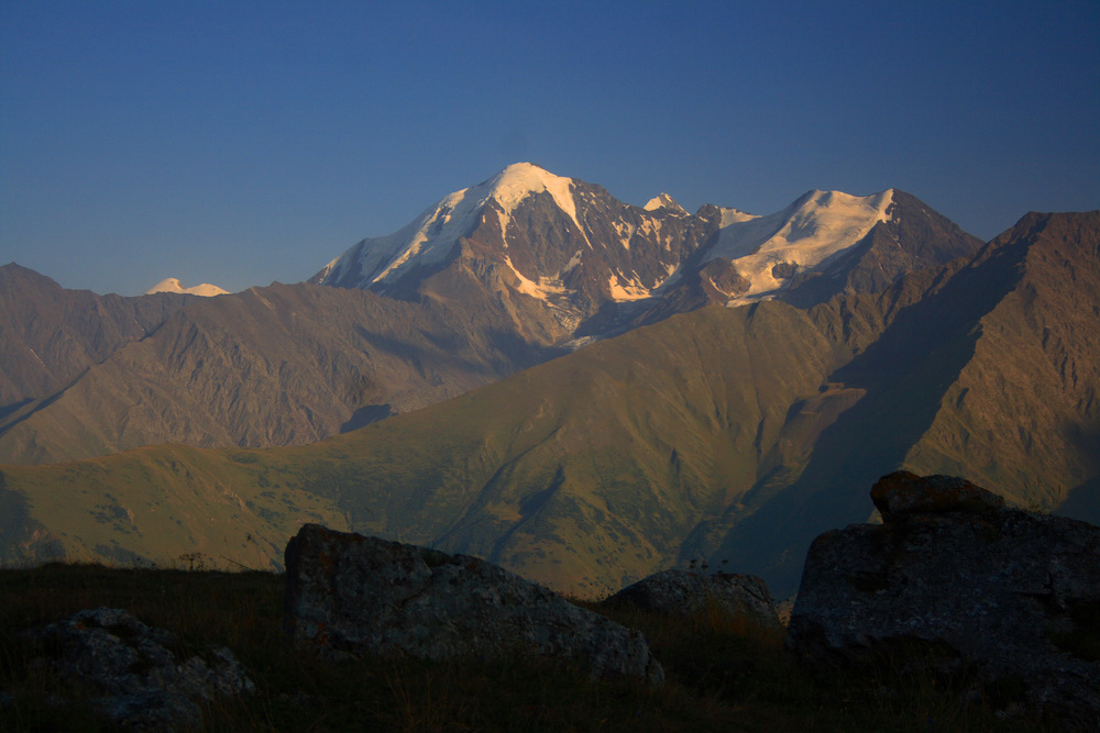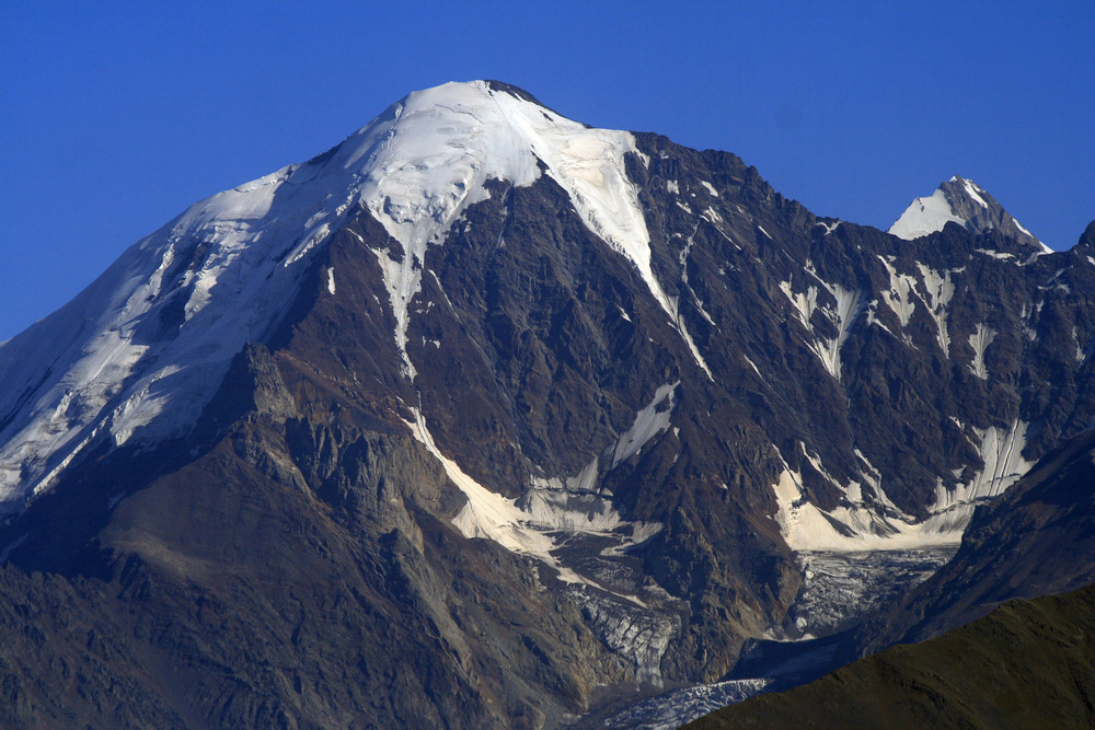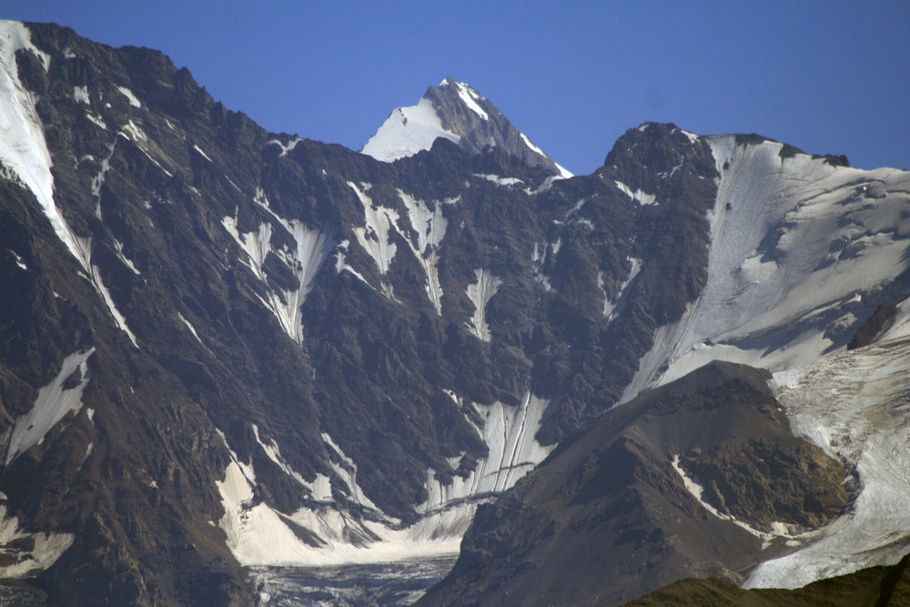 Вершина г.Джимарайхох (4788 м.) (слева), пик 4311, перевал Зайгалан, г.Дружба